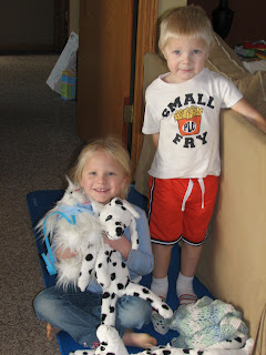 Playing with "cloud dough" (8 c. flour mixed with 1 c. baby oil)...a powdery substance that also holds it's form. Kids loved it. Also required a bath when done. :)
